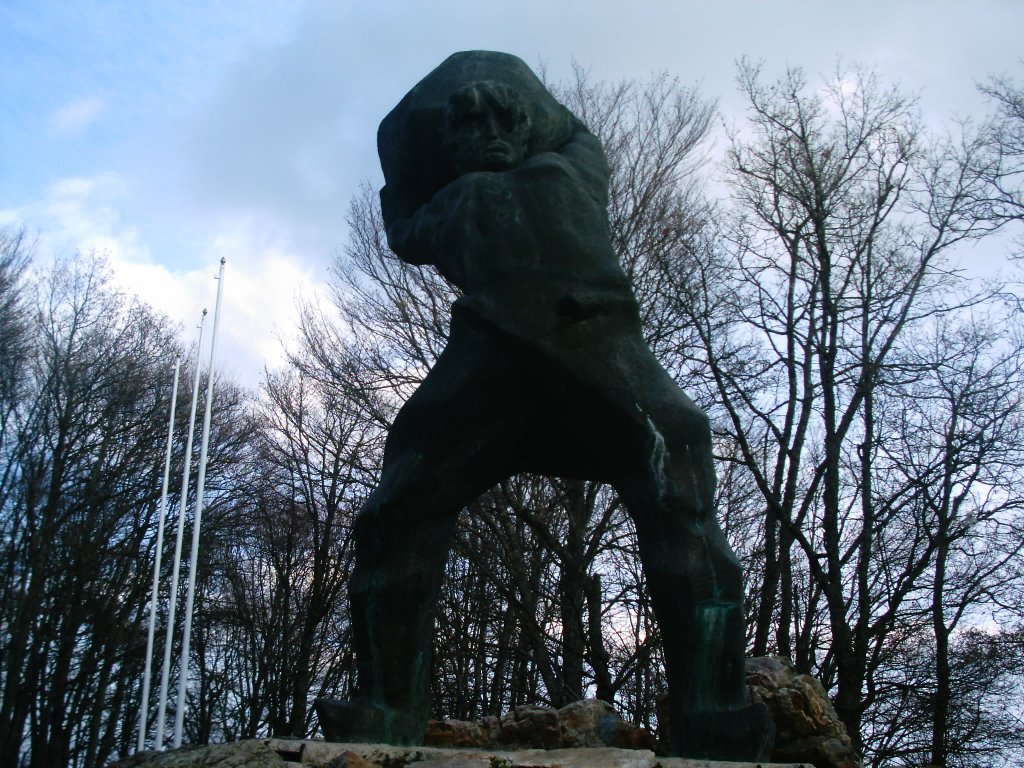 It is a soldier with a highly raised rock above his head and represents the last desperate moment in the struggle of the rebels from the detacehement of the legendary Duke PituGuli, who have their lives in the defense of the Krushevo Republic (which lasted only 10 days).